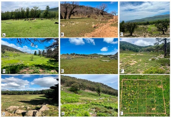 Photographic overview of the surveyed grasslands ((A): Menzla; (B): Bab-Miiz; (C): Mrjabou; (D): Amsemlil; (E): Tafaefra; (F): Tayrsal; (G): Amoukssisar; (H): Bab-Ataba) and the quadrat used for floristic surveys (I).