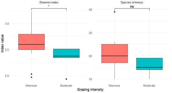 Variation in species richness and Shannon diversity index across grazing intensities. Boxplots represent the median and interquartile range; outliers are shown as dots. * p < 0.05; ns = not significant (p ≥ 0.05). A non-significant difference was observed for richness (Wilcoxon test, p = 0.102, ns), while the difference in Shannon index was also non-significant (Student’s t-test, p = 0.136, ns), despite a slight visual trend.