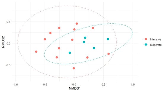 Non-metric multidimensional scaling (NMDS) of floristic composition in grassland communities under moderate and intensive grazing. Each point represents a homogeneous sampling unit. Ellipses indicate one standard deviation around the centroid of each group. No significant compositional differences were detected between grazing intensities (PERMANOVA, p = 0.101), but multivariate dispersion was significantly higher under intensive grazing (p = 0.0007).
