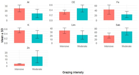 Variation in key physico-chemical soil parameters under moderate and intensive grazing. Bars represent mean values ± standard deviation. Only variables with statistically significant differences between grazing intensities are shown (p < 0.05). Abbreviations: Ar = clay (%), Lim = silt (%), Sab = sand (%), K = potassium (meq/100 g), Fe = iron (ppm), Zn = zinc (ppm), CE = electrical conductivity (dS/m).