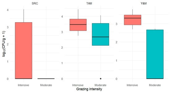 Sulfite-reducing clostridia were exclusively detected in intensively grazed plots, although their abundance showed high variability and did not reach statistical significance. The presence of SRC only under intensive grazing may reflect localized anaerobic microsites resulting from trampling and reduced soil aeration. In contrast, total aerobic mesophilic bacteria did not exhibit significant differences between grazing intensities, although greater variability was observed in moderately grazed plots.