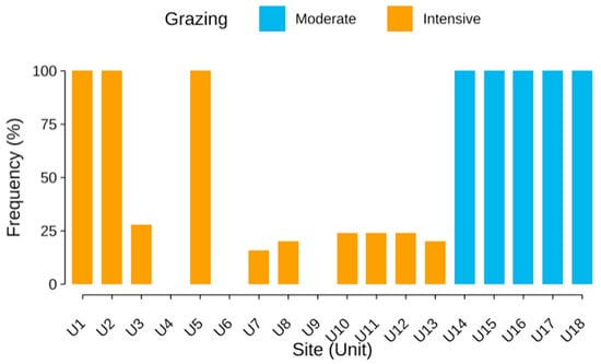 Frequency of Poa annua (%) across homogeneous sampling units under moderate and intensive grazing. Each bar represents one unit (U1–U18), with blue indicating moderately grazed sites and orange indicating intensively grazed sites. Poa annua was present in all moderately grazed units (100% frequency), but showed variable and often low frequency under intensive grazing, with complete absence in three units.