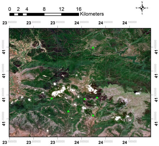 Map of the study area in Falakro Mountain based on Sentinel-2 L2A imagery acquired on 11 June 2024, sourced from the Copernicus Data Space Ecosystem, referenced in WGS 84 (EPSG:4326). Precise coordinates of sampling sites are not disclosed for conservation reasons.