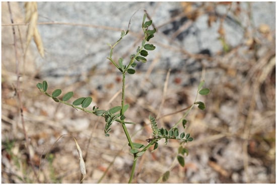 Low-elevation sites were characterized by visibly stressed herbaceous vegetation, with widespread drought symptoms including premature withering and desiccation of Fabaceae species. The survey followed an unusually dry/cold season transition (2024 cumulative precipitation at the Drama station ≈ 505.8 mm vs. a 2009–2017 mean of 660.2 mm; National Observatory of Athens; Institute of Environmental Research and Sustainable Development) that likely compressed spring phenology. According to the National Observatory of Athens, precipitation between October 2023 and April 2024 was only 50% of the 2012–2022 average. Concurrently, the European Centre for Medium-Range Weather Forecasts identified summer 2024 as the hottest since 1993. These anomalies manifested in the field as early senescence or complete lack of flowering in Fabaceae species, particularly those presumed to be O. alba. In several cases, legumes displayed no stem elongation or floral development, suggesting failed reproduction (Figure 2). These observations align with findings in legume species, where drought stress significantly reduces plant productivity through diminished growth, lower photosynthetic activity, impaired carbon assimilation, and alterations in flowering and reproductive success [25,26,27,28].