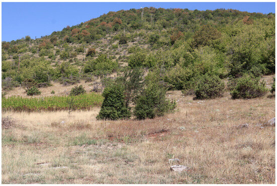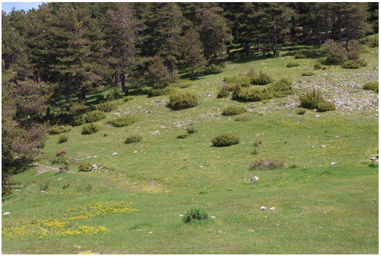 Higher-elevation sites appeared greener but were heavily impacted by recent livestock activity, particularly cattle and equines, resulting in trampled vegetation and grazed patches (Figure 3). Since plants of the genus Onobrychis are highly palatable to sheep, intensive grazing restricts the growth and spread of O. alba, sometimes leading to the plant’s disappearance [6]. While traditional sheep grazing is beneficial and can help maintain open landscapes, uncontrolled and overgrazing can have devastating effects on butterflies and other insects such as bees, an issue increasingly reported across various parts of Europe [29,30,31,32]. Although overgrazing by sheep is not common in Greece, the transition from traditional extensive livestock farming (sheep and goats) to large cattle farming has resulted in plants being heavily grazed and trampled by cattle [9]. Over recent years, cattle farming has increasingly replaced traditional sheep and goat pastoralism in the Falakro region, and equines (primarily mules) are now commonly used for forest product transport in managed woodland areas. Current grazing can cause trampling and selective foraging damage to herbaceous plants. Historically, however, the region also supported wild grazers (e.g., equids, bovids, cervids and caprines), and the arrival of domestic sheep and goats in the Neolithic brought a different grazing regime. While legumes likely adapted to moderate grazing, poorly managed cattle and horse grazing may exert greater disturbance, particularly if seasonal timing overlaps with host plant flowering. Management that mimics intermediate disturbance (rotational, low-intensity stocking; seasonal rests) is more likely to maintain O. alba stands than prolonged, high-pressure grazing.