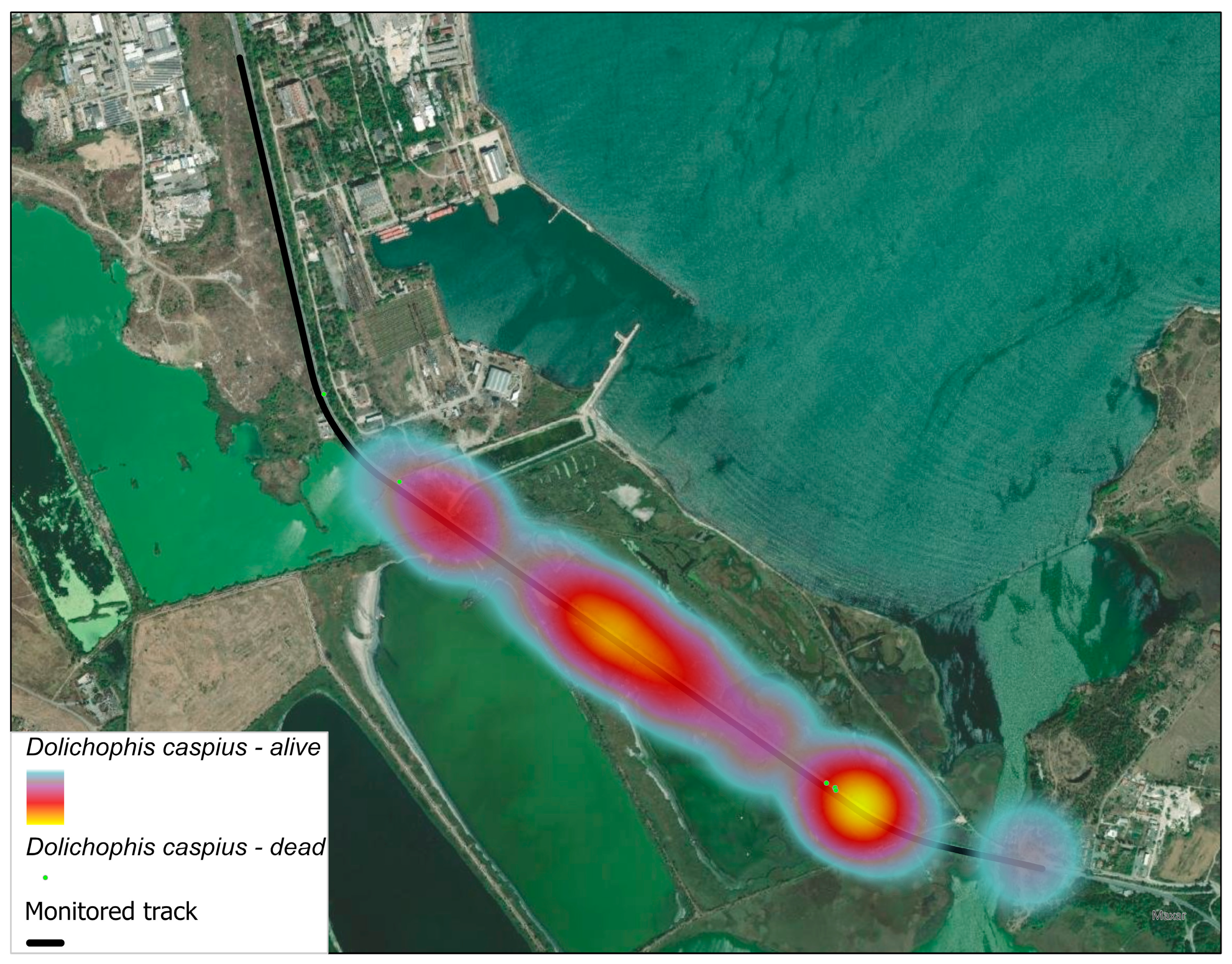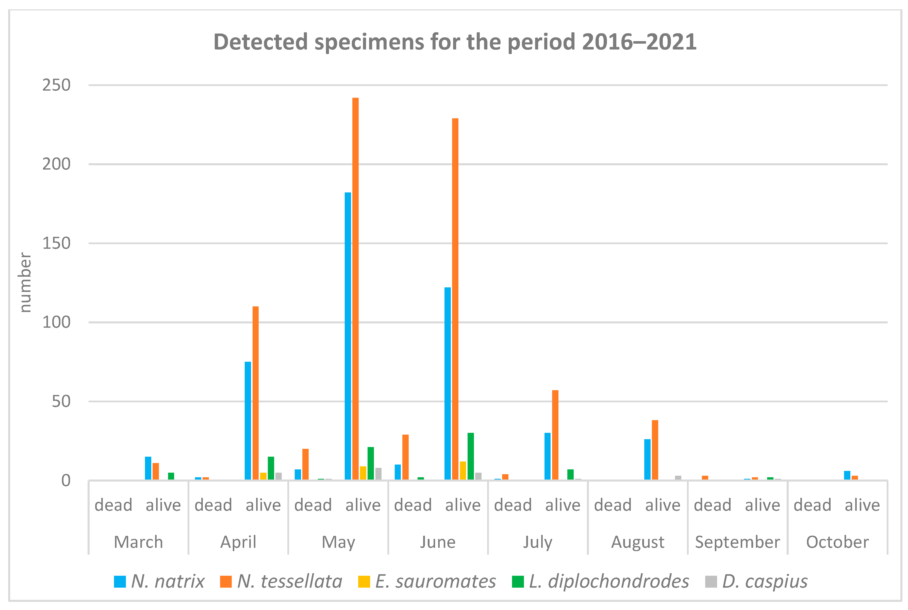 - Telenchev, I.; Mladenov, V.; Georgieva, R.; Redl, E.; Natchev, N. Data of herpetofauna–vehicle collisions in the region of Burgas city, SE Bulgaria. In Proceedings of the 55th Scientific Conference of Ruse University, Reports Awarded with “Best Paper” Crystal Prize, Ruse, Bulgaria, 20 October 2017; 2017; pp. 128–132, ISSN 1311-3321. [Google Scholar]