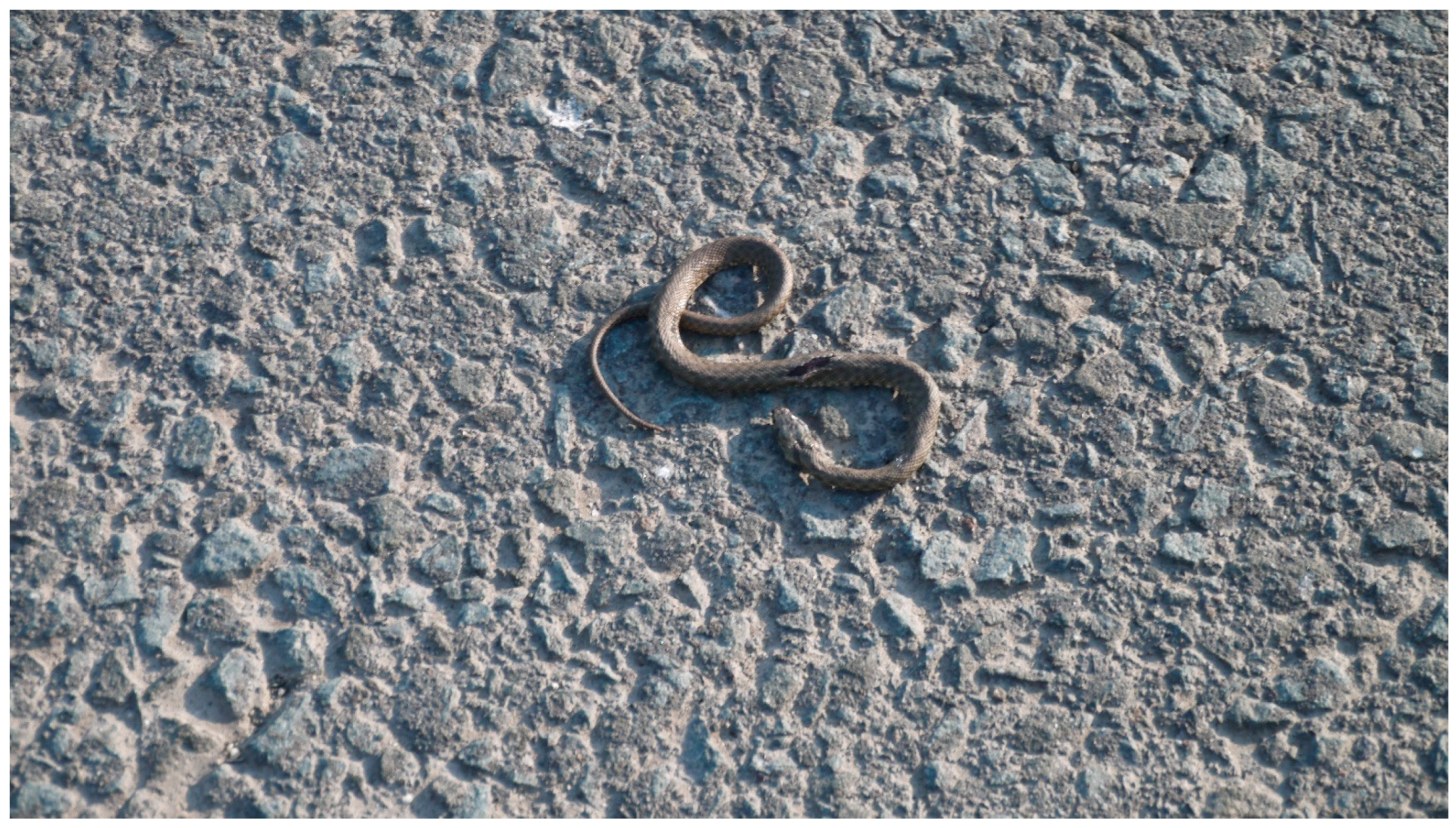- Wagner, B.R.; Brune, R.C.; Popescu, D.V. Snakes on a lane: Road type and edge habitat predict hotspots of snake road mortality. J. Nat. Conserv. 2021, 61, 125978. [Google Scholar] [CrossRef]