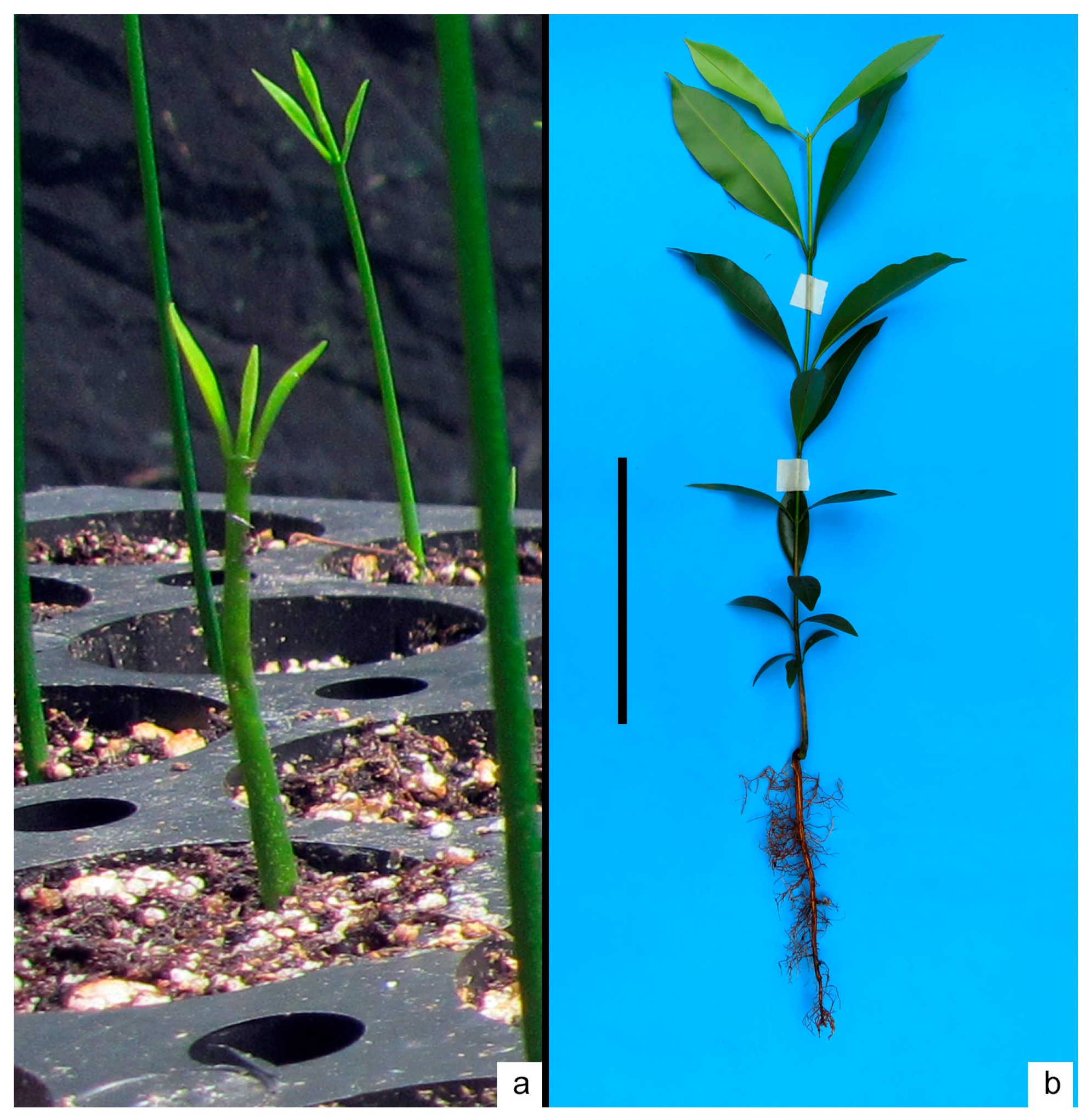 - de Jesus, V.A.M.; Braccini, A.L.; de Souza, L.A.; Moscheta, I.S.; Mariucci, G.E.G.; Santos, F.L. Morphology and Anatomy of the Seedling and the Tirodendro of Calophyllum brasiliense Cambess. (Clusiaceae). Acta Sci. Biol. Sci. 2014, 36, 443–449. [Google Scholar] [CrossRef]