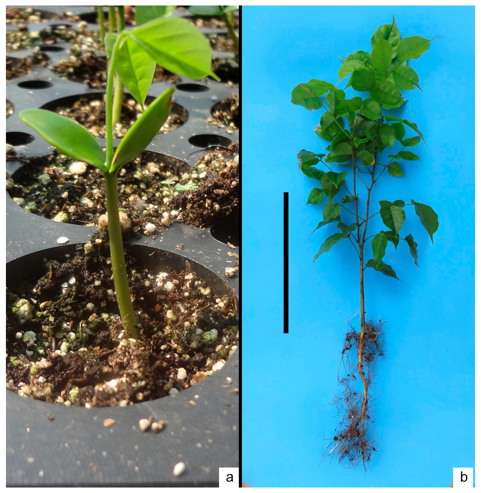 - Lisboa, A.C.; dos Santos, P.S.; Neto, S.N.d.O.; De Castro, D.N.; De Abreu, A.H.M. Effect of Volume of Tubes on the Production of Seedlings of Calophyllum brasiliense and Toona ciliata. Rev. Árvore 2012, 36, 603–609. [Google Scholar] [CrossRef]
