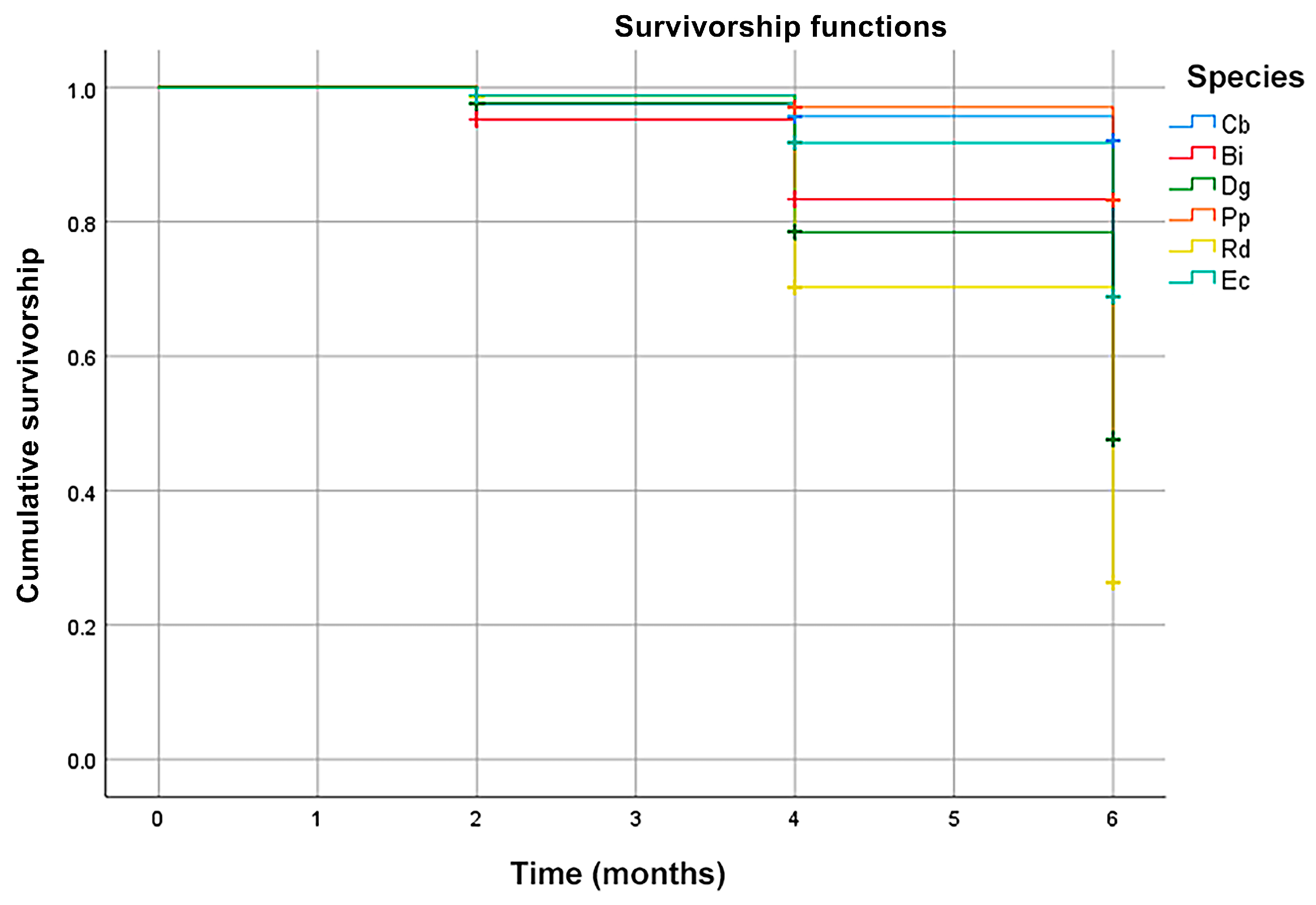- Quispe-Mamani, G.; Lelis Duarte, M.; de Almeida, L.S.; Filho, S.M. Non-parametric survivorship analysis in seed germination of forest species. J. Seed Sci. 2024, 46, e202446036. [Google Scholar] [CrossRef]