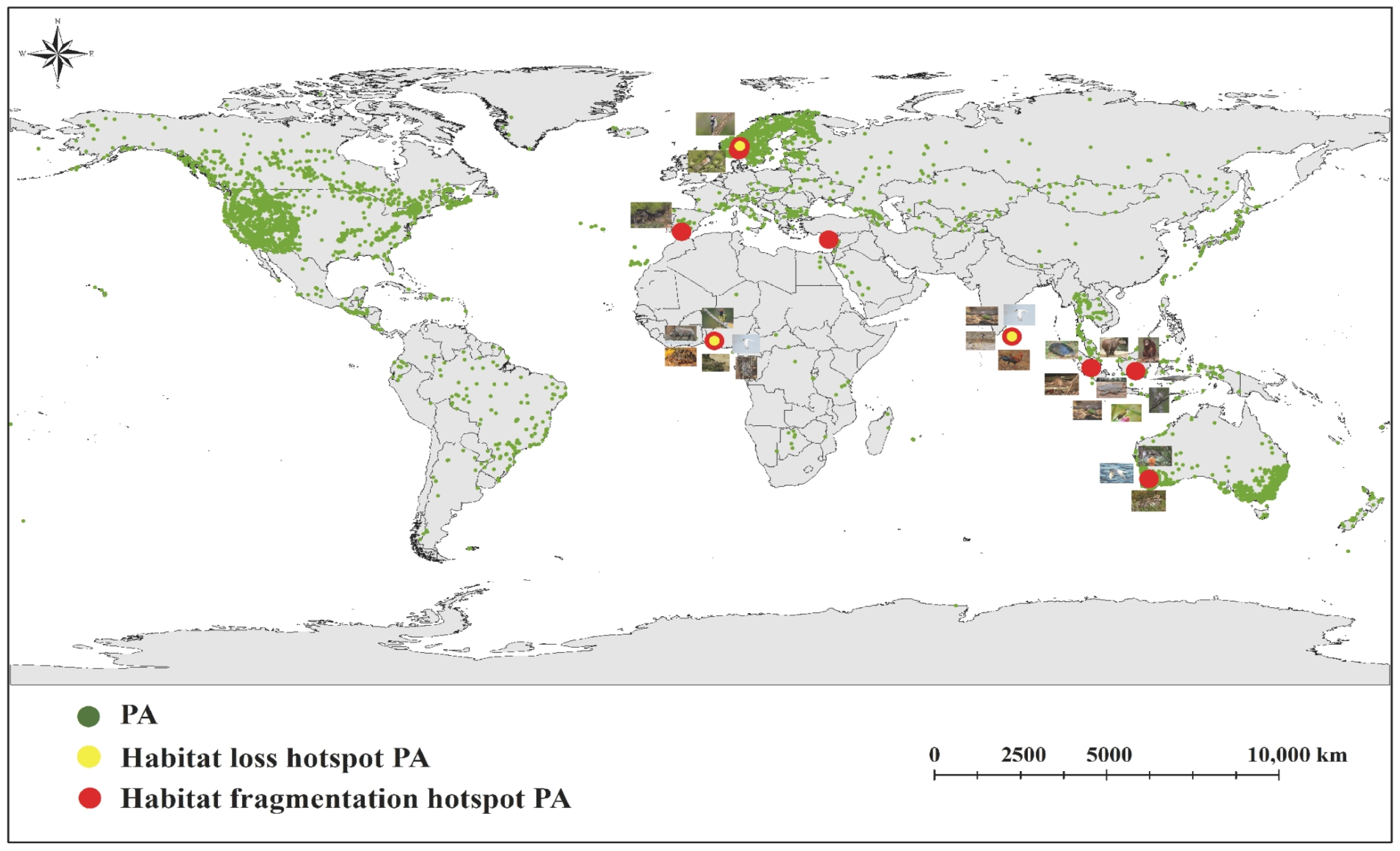 - Yuan, R.; Zhang, N.; Zhang, Q. The impact of habitat loss and fragmentation on biodiversity in global protected areas. Sci. Total Environ. 2024, 931, 173004. [Google Scholar] [CrossRef]