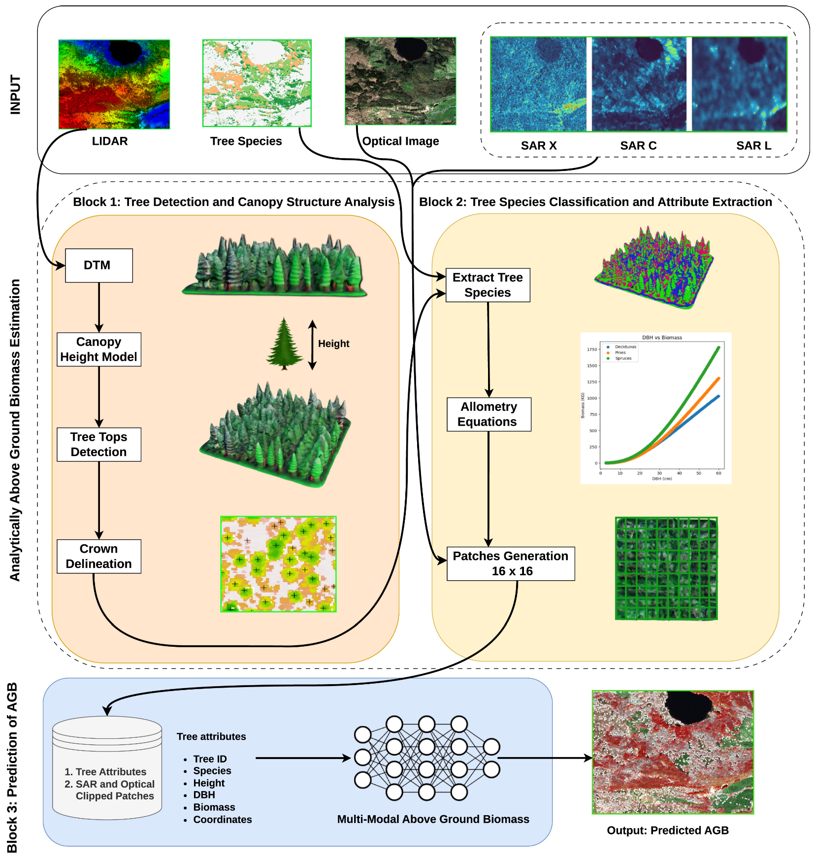 - Hanan, A.; Khan, M.; Fernandez-Anez, N.; Arghandeh, R. DeepBioFusion: Multi-modal deep learning based above ground biomass estimation using SAR and optical satellite images. Ecol. Inform. 2025, 90, 103277. [Google Scholar] [CrossRef]