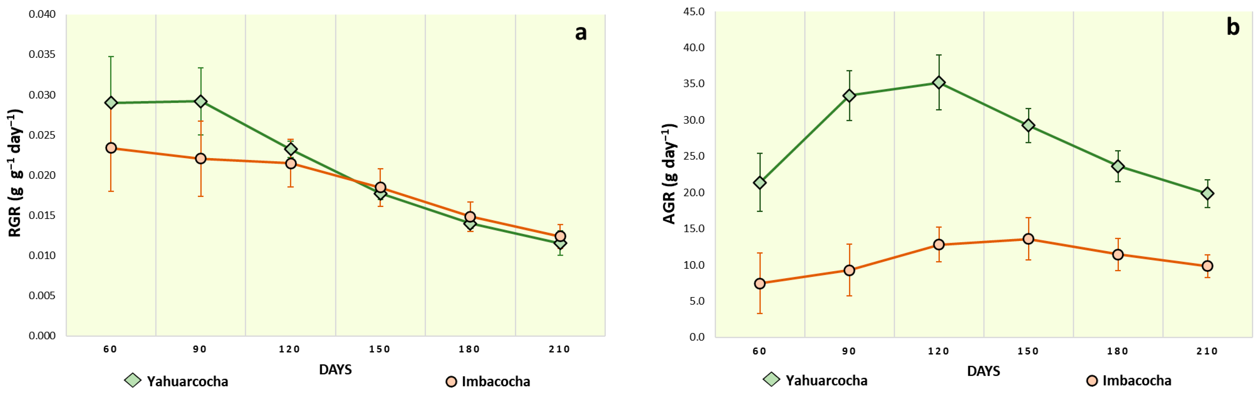 - Hoffmann, W.A.; Poorter, H. Avoiding Bias in Calculations of Relative Growth Rate. Ann. Bot. 2002, 90, 37–42. [Google Scholar] [CrossRef]