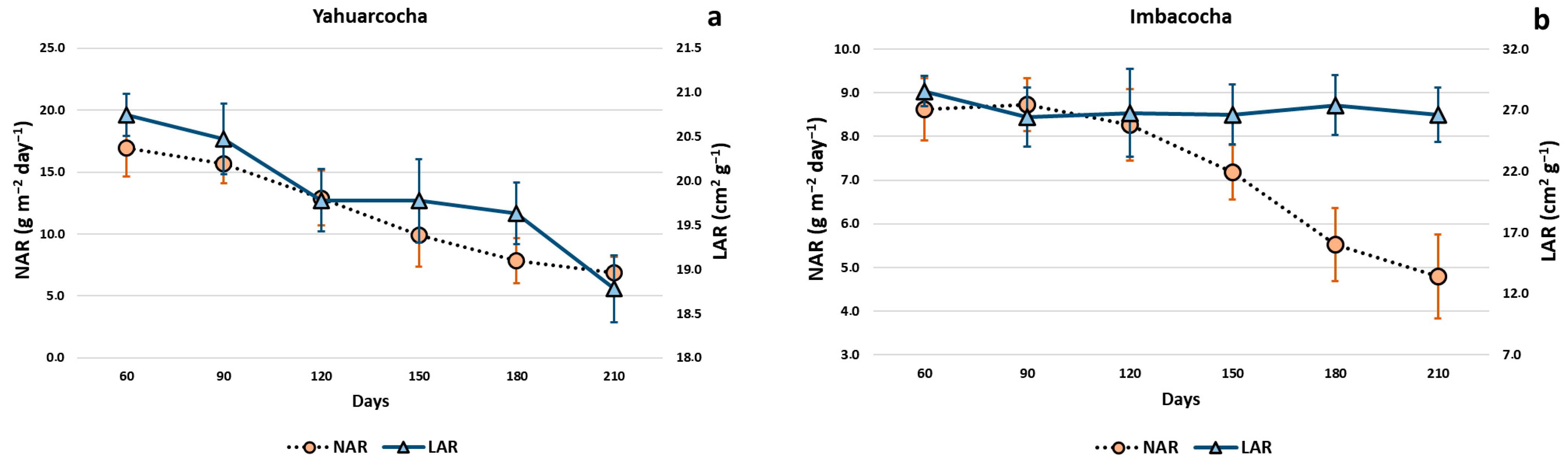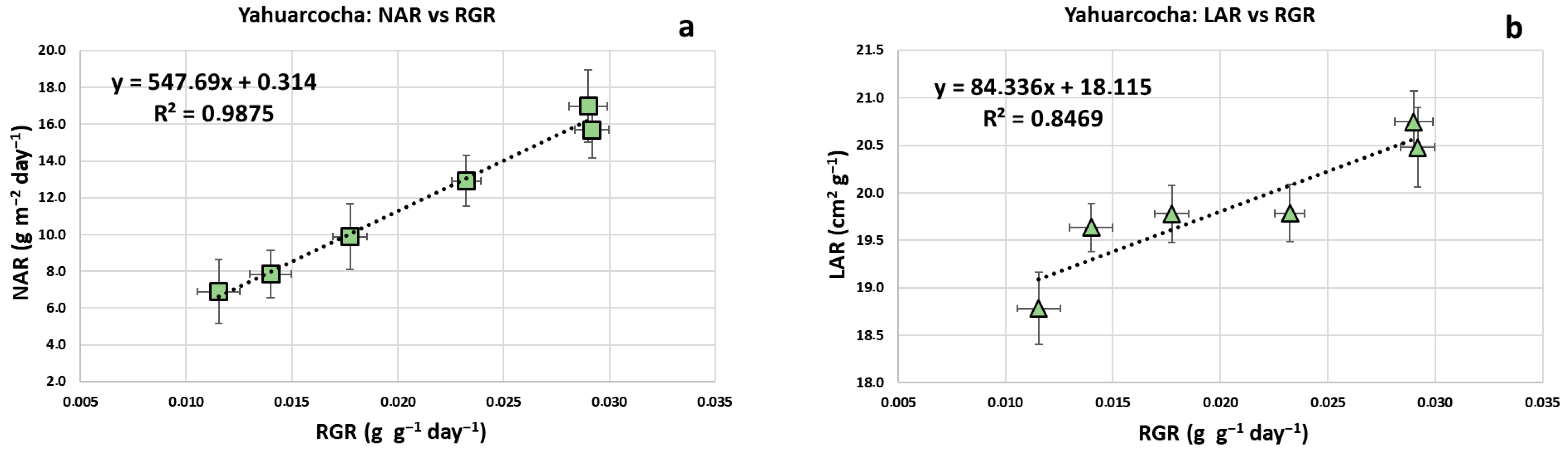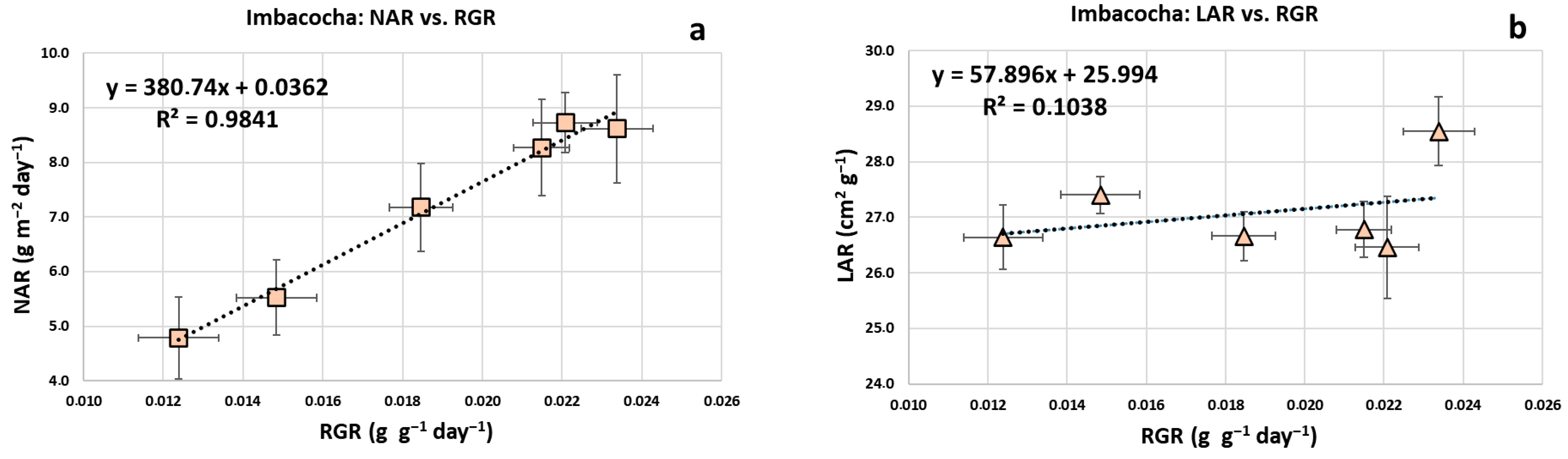 - Poorter, H.; van der Werf, A. Is inherent variation in RGR determined by LAR at low irradiance and by NAR at high irradiance? A review of herbaceous species. In Inherent Variation in Plant Growth. Physiological Mechanisms and Ecological Consequences; Lambers, H., Poorter, H., van Vuuren, M.M.I., Eds.; Backhuys Publishers: Leiden, The Netherlands, 1998; pp. 309–336. [Google Scholar]