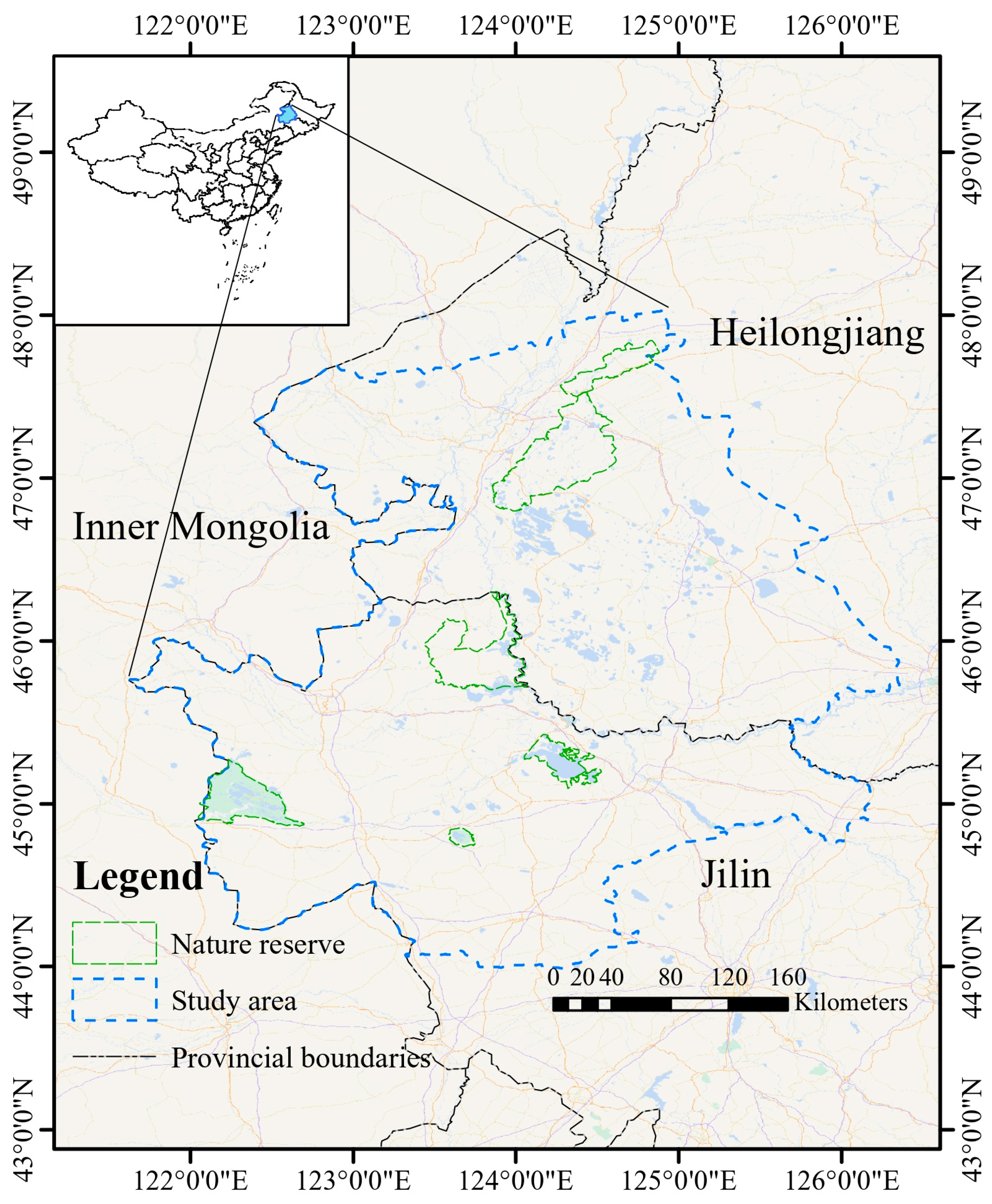 - Huang, H.W.; Liu, Y.; Chen, J.Z.; Li, X.M. Discussion on Scope Demarcation Methods for the Proposed Songnen Plain Crane Homeland National Park. Landsc. Archit. 2022, 29, 26–29. [Google Scholar]