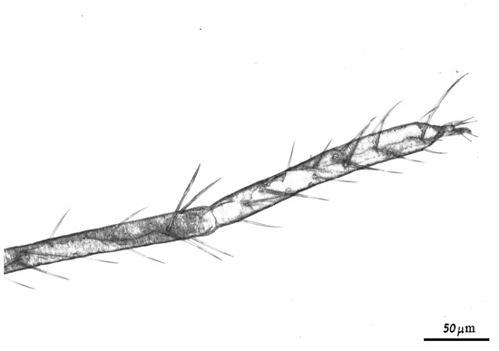 - Tuttle, D.M.; Baker, E.W. Spider Mites of Southwestern United States, a Revision of the Family Tetranychidae; The University of Arizona Press: Tucson, AZ, USA, 1968; 143p. [Google Scholar]