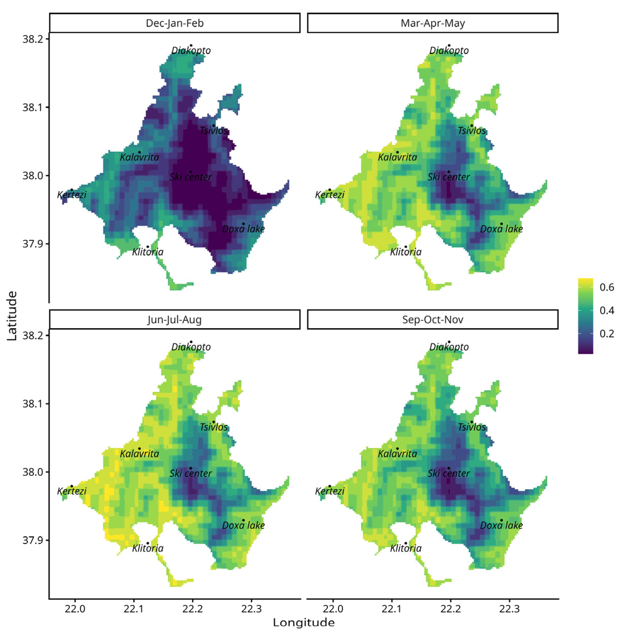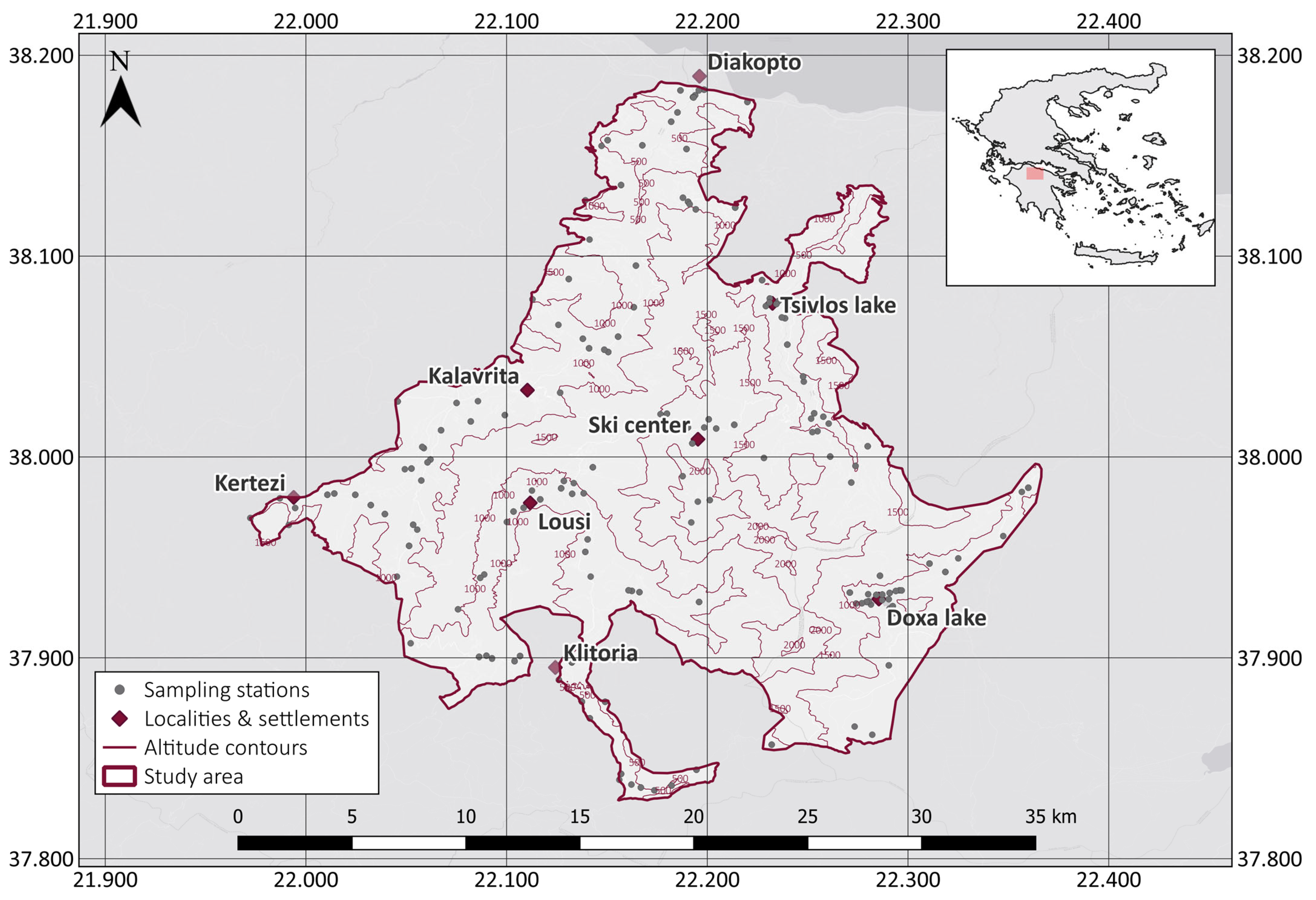 - Kypraios-Skrekas, V.; Lazaris, A.; Koutrouditsou, L.K.; Sotiropoulos, K.; Giokas, S. Patterns and Drivers of Abundance and Diversity of Reptiles and Amphibians in the Protected Area of Mount Chelmos. Amphib.-Reptil. 2024, 45, 383–397. [Google Scholar] [CrossRef]