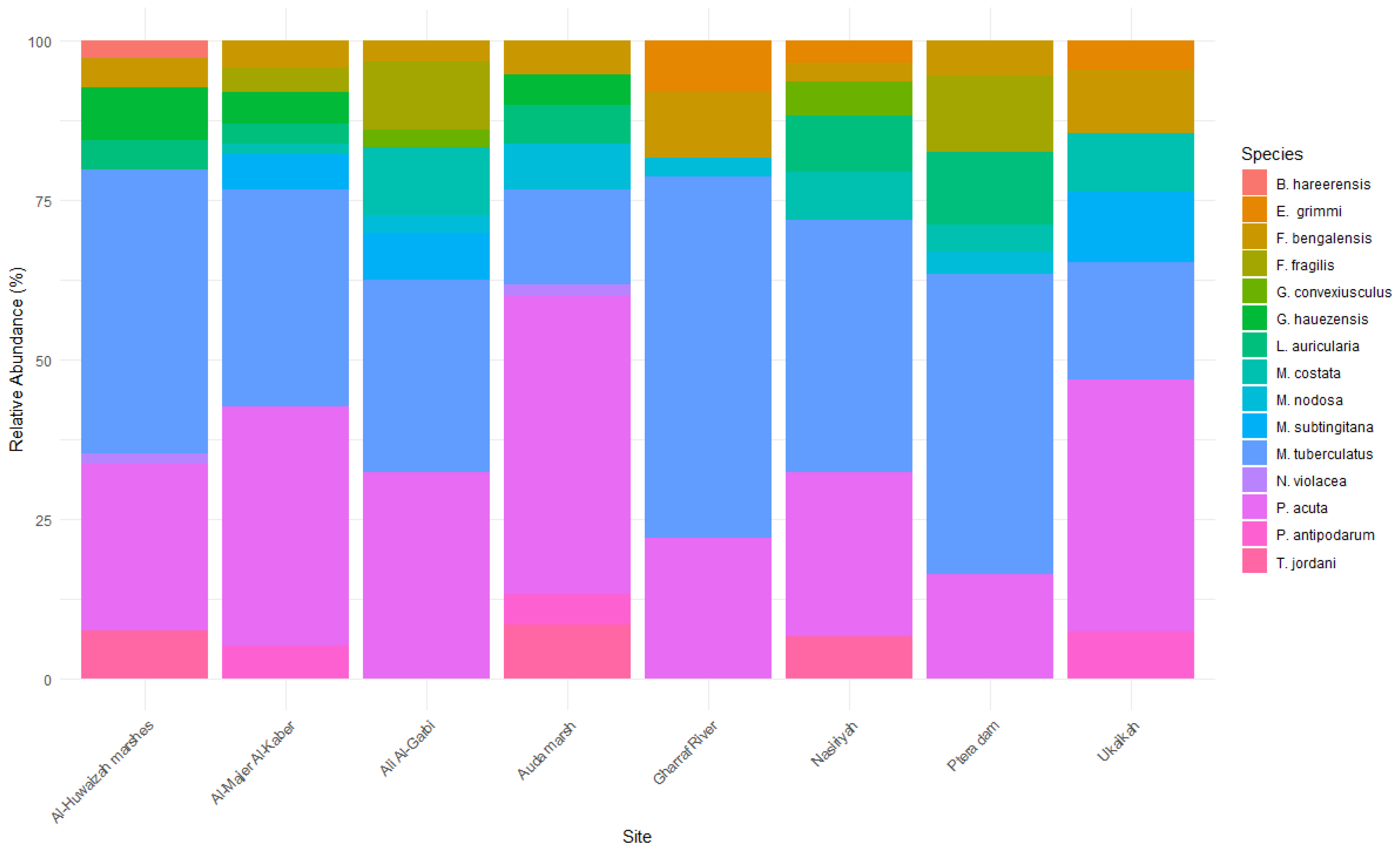 - Naser, M.; Yasser, A.; Geist, J.; Douda, K.; Essl, F. Probable extirpation of Anodonta vescoiana in Iraq: A case study of unionid displacement by Sinanodonta woodiana. Diversity 2025, 17, 415. [Google Scholar] [CrossRef]