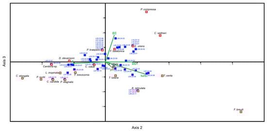 Canonical Correspondence Analysis (CCA) ordination plot defined by the second and third canonical axes showing relationships between collected samples (blue squares), ostracod species (red squares) and environmental variables (green vectors), with species/samples positions reflecting their weighted averages along the displayed environmental gradients.