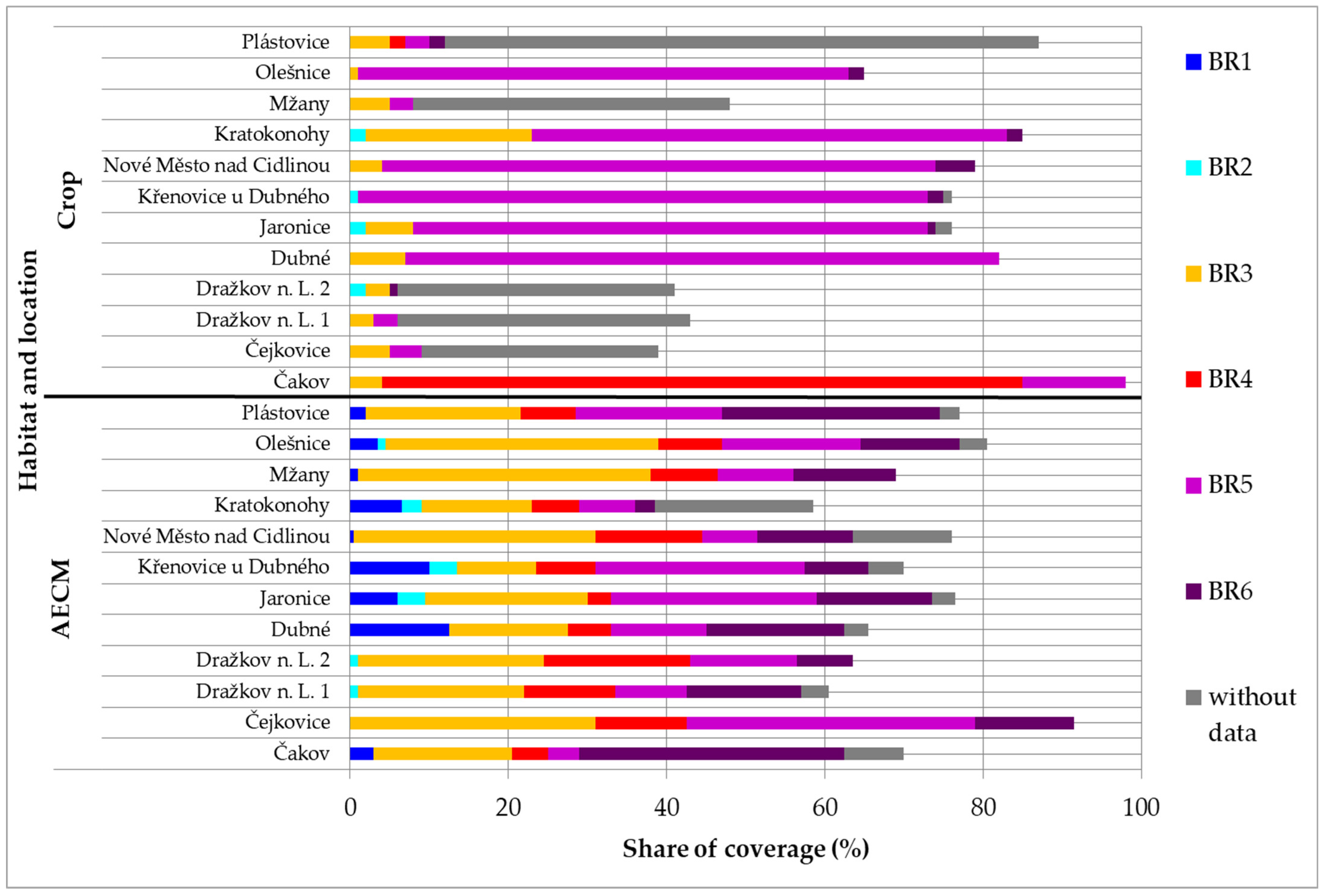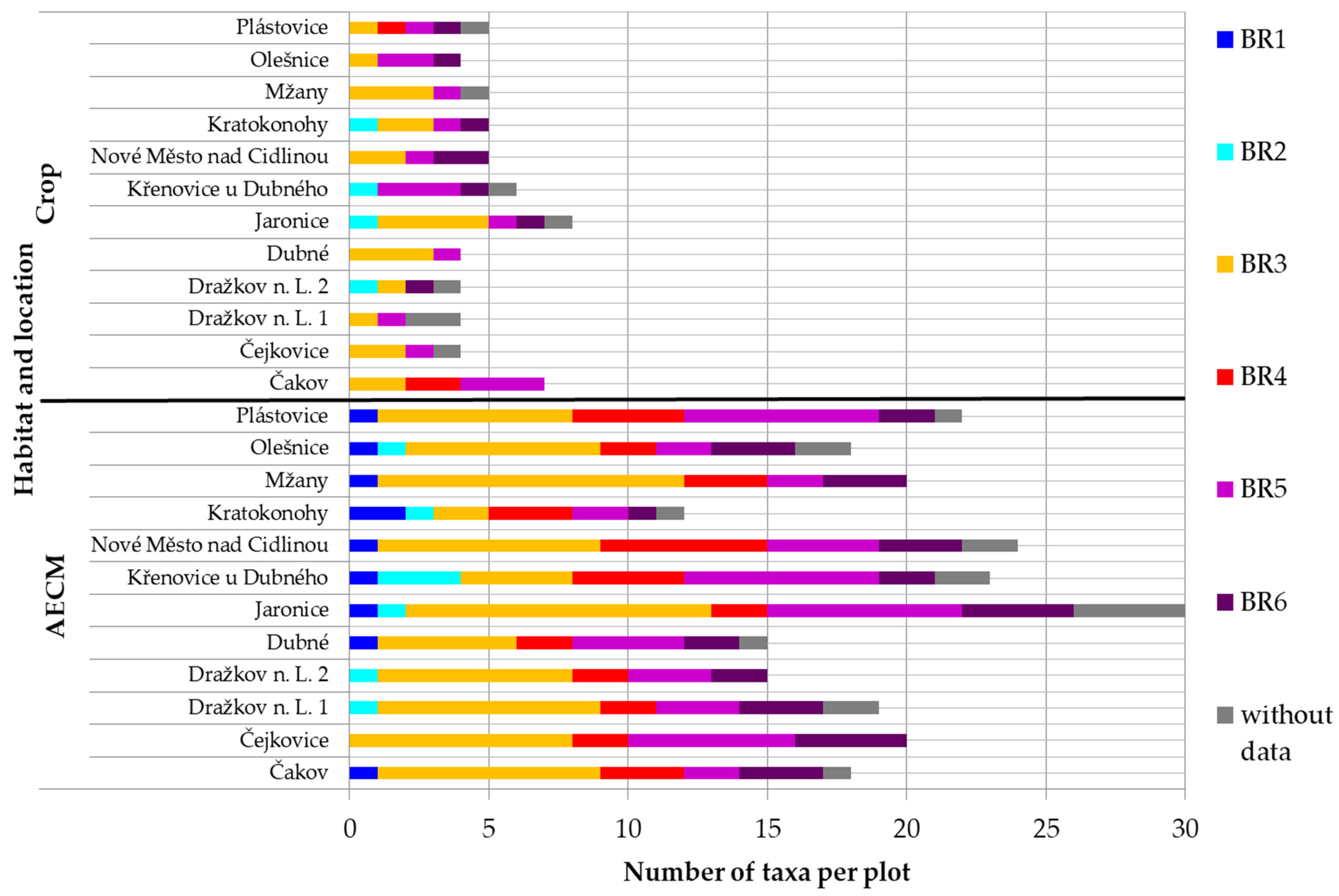 | Species preferring arable land with crop (Crop) | Lolium multiflorum (LolMult), Secale cereale (SecCere), Triticum aestivum (TriAest), Trifolium pratense (TriPrat), Zea mays (ZeaMays). |