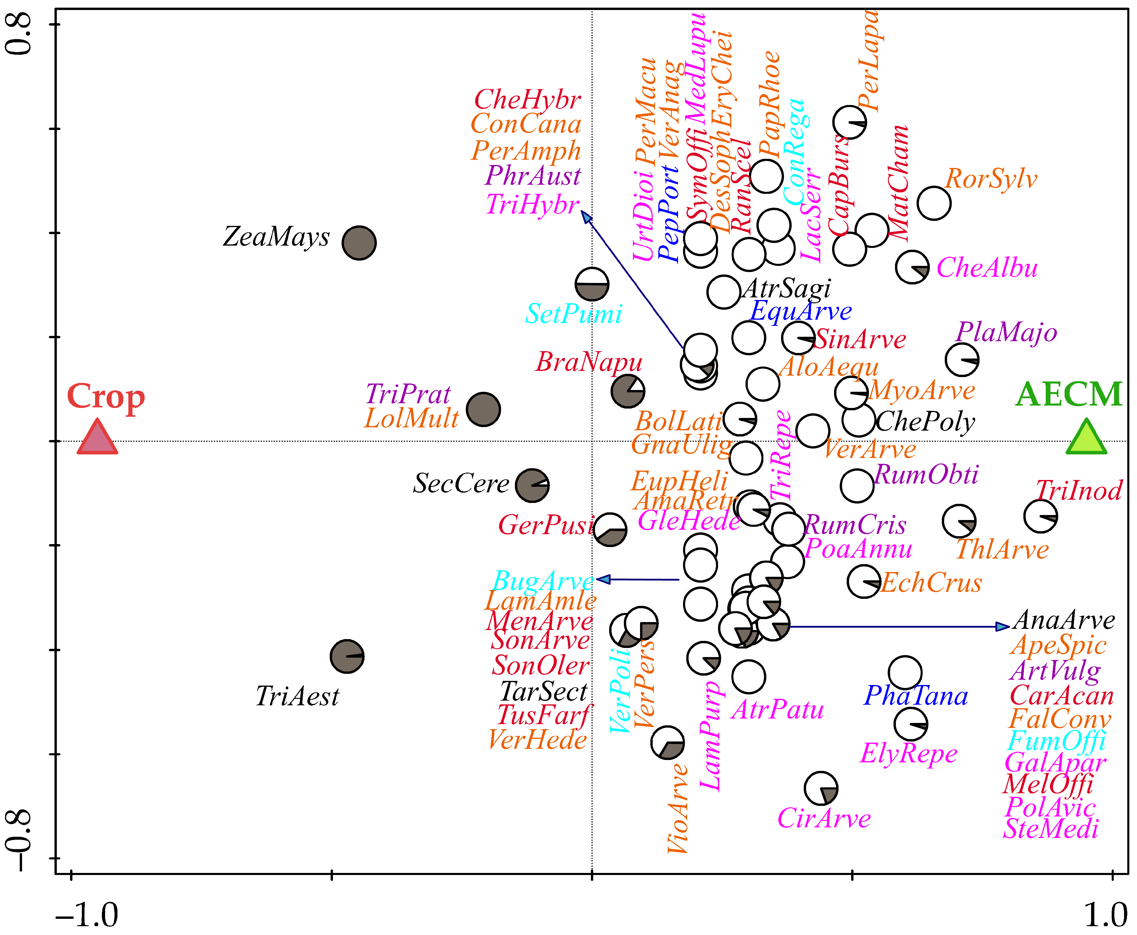 | Species with no AECM/Crop preference | Brassica napus (BraNapu), Geranium pusillum (GerPusi), Setaria pumila (SetPumi), Veronica persica (VerPers), Veronica polita (VerPoli), Viola arvensis (VioArve). |