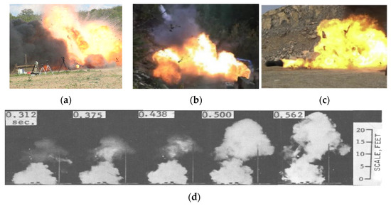 Fireball tests: (a) Under-vehicle Type III tank at initial pressure 31.8 MPa (1.89 kg) [7]; (b) stand-alone Type IV tank at initial pressure 70.23 MPa (1.37 kg). Reproduced with permission from [9], JSAE, 2006; (c) stand-alone Type III tank at initial pressure 35 MPa (3.9 kg) with a partial opening during rupture in a fire. Reproduced with permission from [10], Elsevier, 2018; (d) visible flames after ignition of 7.8 L liquefied hydrogen (LH2) spill in motion during 0.3–0.56 s [11].