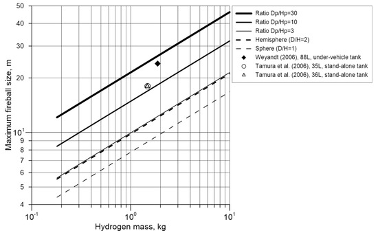 The volume of released hydrogen after expansion to atmospheric pressure and temperature is and the volume of air required to completely burn this hydrogen is (m3). The hemispherical fireball diameter is then , where the volume of combustion products is and the expansion coefficient of products for adiabatic stoichiometric combustion of hydrogen in the air is 6.85 [21]. This leads to the volume of combustion products and theoretical hemispherical fireball diameter: