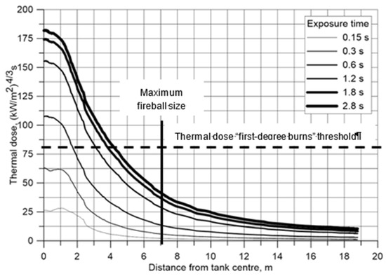 Figure 4 shows thermal doses with distance from the tank accumulated in the time interval 0.15–2.8 s. The horizontal dashed line shows the “first-degree burn” threshold defined by the thermal doze 80 (kW/m2)4/3 s [3]. The “second-degree burns” threshold 240 (kW/m2)4/3 s [3] was not reached even after 2.8 s of fireball simulation. Though in simulations the fireball existed up to about 4 s, increase of exposure time beyond 1.8 s practically does not result in increase of the thermal doze. The fireball itself also presents thermal hazard, i.e., temperature. The vertical solid line in Figure 4 shows maximum fireball radius 7 m recorded in experiment [4]. The hazard distance defined by fireball size exceeds the hazard distance defined by thermal dose during the whole fireball development period.