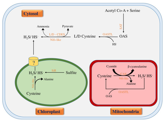 Biosynthesis of H2S in plants: In plants, biosynthesis of H2S occurs in cytosol, chloroplast, and mitochondria. In the cytosol, L/D cysteine is formed by the addition of sulfide into OAS (O-acetyl-ser) catalyzed by OASTL (O-acetylserine(thiol)lyase) enzyme. H2S is released from L/D cysteine in a reaction catalyzed by L/D-CDES (L/D cysteine desulfhydrases) along with the release of ammonia and pyruvate. In chloroplast, H2S is formed from sulfite by SiR (sulfite reductase) during photosynthetic sulfate reduction pathway. It is transported to cytosol from chloroplast by an unknown transporter. In mitochondria, H2S is formed from cysteine by the concomitant release of cyanide and β-cyanoalanine catalyzed by CAS (β-cyanoalanine synthase). Nifs-like proteins also release H2S by converting cysteine to alanine.