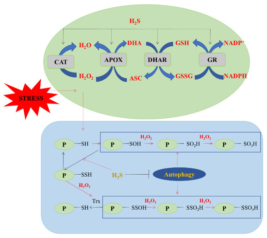 In addition, autophagy is a process that gets activated during wide categories of stresses such as nitrogen, carbon, or any other nutrient deprivation and this process mainly disrupts the cytoplasmic bridges along with various organelles comprising of ROS-regulating and scavenging enzymes [63] (Figure 3). To elucidate, CAT enzyme localized within peroxisome is degraded by authophagy through H2O2 intervention [64]. Alongside, autophagy also denatures oxidised proteins in plants during stressed conditions. On the contrary, the basic autophagic process that degrade cytoplasm and its components for raw materials and energy related metabolic activities, the fine tuner process encompassing H2S-mediated persulfidation forms a much more conventional, rational, and competent approach in terms of growth, development, and defense related processes in plants, specifically during stressed conditions. In the forging arguments, the previous studies conducted revealed the negative aspect of autophagic regulation by H2S in Arabidopsis [37]. Additionally, they also suspected that H2S when applied exogenously mitigated nitrogen deficiency and modulated the levels of anthocyanins along with suppressing autophagy and nitrogen deficiency in plants. Besides, H2S-mediated responses also enhanced ROS levels, thereby showing the trio among ROS, H2S, and autophagy during protein modifications in plants [65].