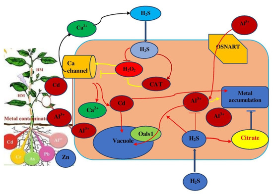 Furthermore, Al3+ toxicity is one of the most common environmental factors that limits crop productivity by root growth inhibition, especially in acidic soil. Under Al3+ toxicity, an increase in root length and decrease in Al3+ content in root tip of rice can be achieved by exogenous application of H2S [27]. H2S scavenger (HT) reversed these effects, suggesting that H2S is involved in the alleviation of Al3+ toxicity in rice. Pectin, a polysaccharide component of cell wall was involved in the tolerance of Al3+ in plants and Al3+ is mainly accumulated in the hemicellulose component of the cell wall in plants [54]. Hemicellulose and pectin level was significantly decreased by H2S in order to reduce the Al3+ content in the cell wall of rice root [79]. Furthermore, the expression of genes which encode certain proteins necessary for the detoxification of Al3+ in plants is regulated by H2S. On the other hand, the protein level can be enhanced by H2S to prevent Al3+ entry in cytoplasm. Al3+ deposition is reduced by UDP glucose, which is transported to the cell wall from cytoplasm via an ATP binding cassette transporter STAR1-STAR2 complex [80]. OsSTAR1 and OsSTAR2 expression was significantly enhanced by H2S, suggesting that Al3+ resistance is increased by H2S. Additionally, in rice Al3+ toxicity can be increased by citric acid secretion [81]. A citrate efflux transport involved in Al-induced citrate secretion is encoded by OsFRDL4 [82]. Under Al3+ stress in rice exogenous application of H2S improved OsFRDL expression and significantly increased citrate content in root exudates. These results suggest that in rice, citrate secretion could be regulated by H2S to enhance resistance to Al3+ toxicity. Similarly, expression of OSNRAT1, which encodes aluminum transporter 1 (NRAMP) is decreased by H2S by decreasing the Al3+ amount, which enter the root cells [54]. These results indicate that activity of some proteins is regulated by H2S by blocking the Al3+ entry in the root cells, resulting in enhanced Al3+ tolerance in rice. On the other hand, sequestration of Al3+ from cytoplasm to vacuole depends on half- sized ATP binding cassette transporter. OsALS1 stimulated by H2S results in Al3+ sequestration in the vacuole, suggesting that Al3+ can be alleviated by H2S through the reduction of the Al3+ content in symplast and apoplast of rice root. Collectively, it would be safe to accord the involvement of H2S in plant metal tolerance essentially by influencing the absorption of metal ions and their transport [61] (Figure 4).
