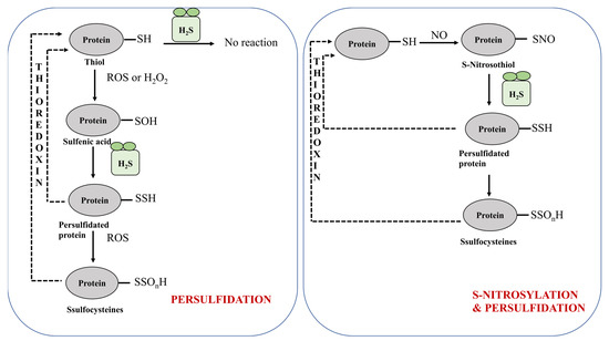 As discussed earlier, H2S perform its function by promoting the persulfidation of active cysteine moiety of protein into persulfide form via covalent conversion of thiol group into persulfide group [97,98]. However, the studies suggests that there is no direct reactivity between the thiol group of protein and H2S group. The reason behind this non-reactivity is due to the oxidation of both hydrogen and sulfur atoms in the reaction, the electrons thus produced end up as protons that are not able to form hydrogen gas [89]. Despite this, when the thiol group of protein reacts with hydrogen peroxide, the oxidized product formed is Sulfenic acid (R-SOH), which further reacts with H2S to form persulfidated (R-SSH) product. Furthermore, the resultant component thus formed reacts with reactive oxygen species (ROS) and generate the product, perthiosulfenic acid (R-SSOH), which has low stability. Further, it has been documented by Filipovic [89] that if the excess number of oxidants are present, R-SSOH may get further converted to two products via oxidation namely, perthiosulfinic (R-SSO2H) and perthiosulfonic acid (R-SSO3H). It has been reported that within the cell the level of persulfidation is regulated by thioredoxin, i.e., thioredoxin is involved in catalyzing the reverse reaction of persulfidation (Figure 5) [58,66]. This reversion reaction of protein persulfidation evades the chances of irreversible oxidative damage that normally occurs at the thiol group of the protein [5,66,98].
