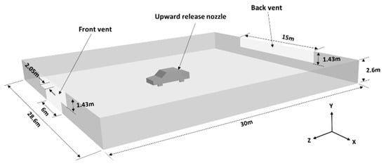 The outer domain for the car park was L × W × H = 170 × 128.6 × 2.6 m. Both geometries were axis-symmetric lengthwise. A hexahedral mesh was generated throughout the domains. Whilst the walls were not meshed, conduction heat transfer through them was accounted for. The geometry and materials were the same as those described in previous work [11] where the floor, walls, and the ceiling were 0.15 m thick concrete. The car body and release pipe (where the car was not modelled) were made of aluminium, further details on the material properties can be found in previous work by the authors [11]. A box mesh technique with mesh interfaces was implemented to provide a refined mesh around the nozzle making it possible to have improved resolution in the required areas without a significant increase in a total number of control volumes. A no-slip condition was applied at the solid surfaces. The domains were assumed to be initially 100% air at standard atmospheric pressure and temperature, i.e., 101,325 Pa and 293.15 K respectively.