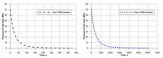 Pressure dynamics for adiabatic blowdown from 70 MPa, 117 L tank for 2 mm (left) and 0.5 mm diameter TPRD (right).