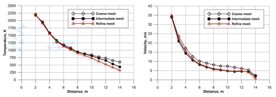 Case 1 (Table 1) with a constant mass flow rate upward release in the covered car park through TPRD = 3.34 mm was selected for grid independence study. At each refinement step the average length of the computational cells was halved inside the car park. Attention was paid in areas where high gradients and complex phenomena were expected for example, at the leak point, and the ceiling as recommended by Baraldi et al. [27]. Temperature and velocity were measured at points under the car park ceiling at 1% of the height from the nozzle exit to the ceiling, H, at an increasing radius from the jet axis at a flow time of 5.5 s. The temperature and velocity results are shown in Figure 3. It can be seen that mesh resolution does not affect the results at the points close to the jet axis for temperature although a difference is evident for points, further from the axis, closer to the car park walls, in this region the gird is coarser with cells in the region of 20–30 cm lengthwise. However, the height of the cells is constant with distance from the jet axis to ensure the points at a distance of 1% H are captured.
