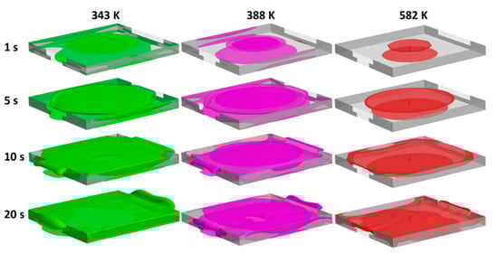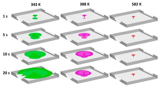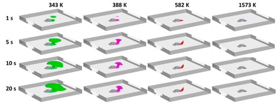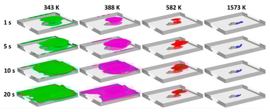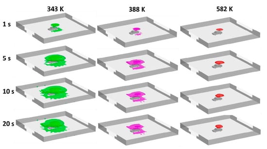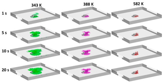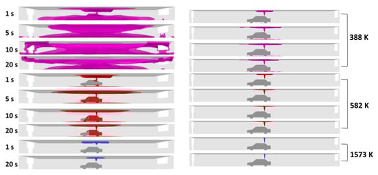 Vertically downward ignited hydrogen releases through TPRD = 2 mm (case 4) and TPRD = 0.5 mm (case 9) were simulated. The downward release from TPRD = 2 mm is shown in Figure 10. It can be seen how the car body and vertical downward direction of the release played an important role in decreasing the extent of the hot cloud at the fatality limit temperature. The hot cloud at 582 K reached a maximum extent within 5 s of the release decreased to a limited area above the car, as shown in Figure 10 and Figure 11. However, the gas at 343 K (no-harm limit) and 388 K (pain limit) spread out within the car park, covering the upper layer with potential consequences for public safety.