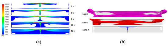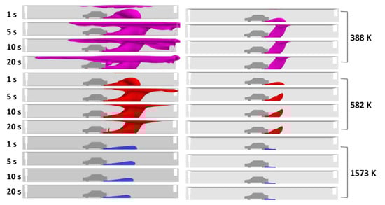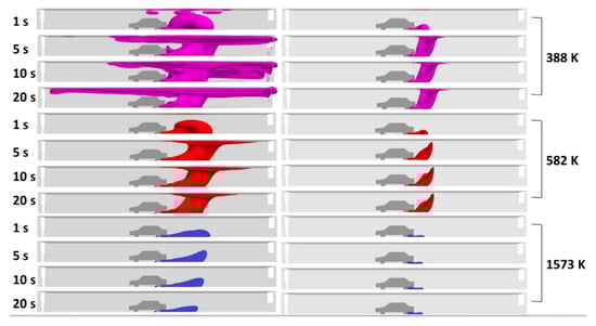 An upward release through TPRD = 0.5 mm from the car body (case 8) is presented in Figure 9. As noted, this case is similar to case 7 but with the inclusion of the car body and a higher release point. The area under the ceiling, covered by the hot gas at a temperature of 582 K increased compared to case 7. However, the leak point is closer to the ceiling, and the cloud at 582 K reached a maximum within 5 s and decreases to a radial distance of 2 m under the ceiling from the jet axis. It should be noted that this case, i.e., TPRD = 0.5 mm, is inherently the safest case scenario investigated here for an upward release as could be expected.