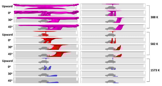 Iso-surfaces of temperature at a release time of 20 s are compared for all TPRD = 2 mm and TPRD = 0.5 mm cases which include the car body in Figure 19. The hydrogen jet fire from TPRD = 2 mm led to the upper layer of the car park upper being covered with a hot gas at 388 K for all release directions considered, i.e., upward and downward with 0°, 30° and 45° angles. The hot products at 582 K for this TPRD diameter covered the top layer close to the ceiling with a radial distance of 5 m in the case of an upward release. The car body and the floor surface were heated up due to the radiative heat transfer from the upward release flame, this might become a safety issue for people and unprotected first responders. The vertically downward release (0° angle with the vertical axis) spread out from three sides of the car, as the release occurred close to the back of the car. The hot gas at 582 K to the left and right sides of the car might block passenger escape routes. From the 30° and 45° angle comparison, it can be seen that the downward release at an angle appears to be safer in this sense compared to the vertically downward case as there is no hot gas at 582 K in the vicinity of the sides of the car, rather it is directed away in a “tail” from the back. The release angle of 30° lead to jet at a temperature of 582 K around 5.5 m away from the car, 1 m less than that predicted in the case of a 45° release angle. The flame, as it is considered as a lethal threshold, was dangerous when the release was vertically downward, and blocked doors, whereas a release angle of 30° and 45° lead to a jet flame from the back of the car.