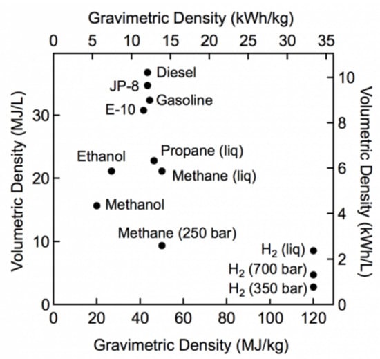 Nowadays, the two most common methods commercially used to store hydrogen are in gaseous form at high pressure (350–700 bar at 20 °C) and in liquid form at cryogenic temperature (at −253 °C and 1 bar of pressure) [10]. The pressurization of hydrogen allows for improving the volumetric energy density, which, however, remains remarkably lower than those of the most common fossil fuels. In fact, gaseous hydrogen compressed to 350 bar and 700 bar possesses volumetric energy densities of 3 MJ/L and 5.6 MJ/L, respectively, whereas the volumetric energy density of gasoline is 32 MJ/L (Figure 1).