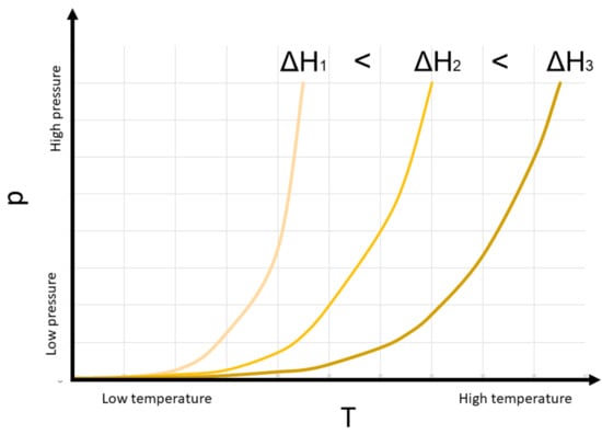 where R is the universal gas constant. For many metal hydrides, the value of ΔS is approximated to the standard entropy value of hydrogen S300K = 130.77 J/(K∙molH2). A graphical representation of the effect of ΔH on the stability of three hypothetical metal hydrides is provided in Figure 3. The regions of temperature and pressure on the left side of each p and T equilibrium curve are those conditions where the hydride phases are stable. On the contrary, the regions on the right side of the curves indicate those conditions under which the hydride phases are not stable and therefore decompose. The p and T equilibrium curves also indicate that, for a given pressure value, the increment in ΔH leads to a shift in the equilibrium temperature toward higher values.