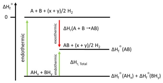 Schematic enthalpy diagram depicting the RHC approach applied to a two-component system (AHx and BHy), which, upon dehydrogenation, forms a single compound (AB) plus hydrogen. ΔHf° = standard enthalpy of formation.