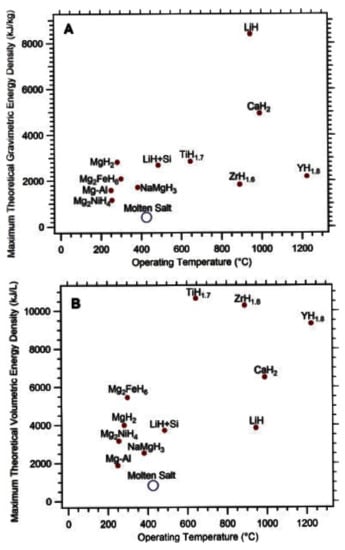 Maximum theoretical (A) gravimetric and (B) volumetric energy storage densities of select metal hydrides compared to existing molten salt technology [66].