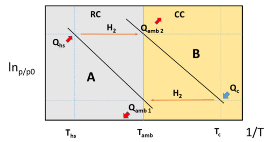 During the RC, the heat provided from the available sources (Qhs) is supplied to the reactor containing hydride A, causing its dehydrogenation once its equilibrium pressure rises above that of hydride B. In this case also, the heat generated by the hydrogenation of hydride B (Qamb 2) will have to be released into the ambient environment. A schematic representation of the functioning principle of a MHCS is presented in Figure 7.