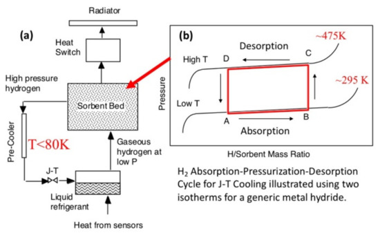 Interestingly, the potential field of application of hydride-based systems as cooling systems can be extended further beyond the Earth boundaries into outer space, as demonstrated by the works of Strumpf and Bowman [79,80]. In their works, they described the possibility to provide cooling or refrigeration for a variety of space applications that require constant operating temperatures (e.g., optics cooling, detectors cooling, personal astronaut cooling during extravehicular activity, food refrigeration and freezing, extraordinary medical needs, and habitation cabin cooling) using hydride-based systems (Figure 8). These cooling devices are widely called cryocoolers and operate exploiting the Joule–Thomson (J–T) effect. In this context, the advantages provided by the use of such hydride-based technology are mostly related to the compactness of the cooling device, as well as the complete lack of vibrations that can limit the performance of highly sensitive devices to record undistorted signals.