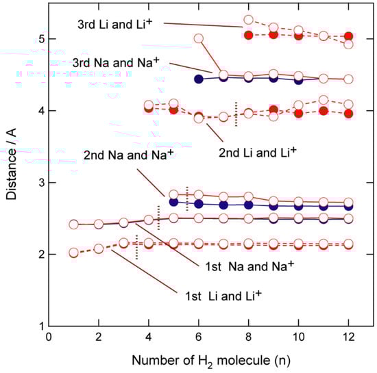 CAM-B3LYP/6-311G(d,p)-calculated M-H interatomic distances in GR-M-(H2)n (n = 1–12, M = Li, Li+, Na, and Na+) as functions of the number of H2 molecules (n).