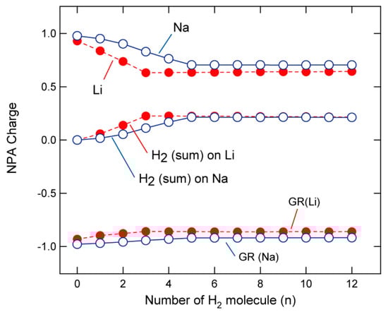 The NPA-determined charges on Na, GR, and H2 (summation of molecular charges over all H2 molecules) are plotted in Figure 4 as functions of n. The Na and GR charges were calculated to be +0.978 and −0.978, respectively, when n = 0 (without any H2 molecule), which indicates that the unpaired electron of Na is fully transferred to GR, and that the electronic state can be expressed as (Na)+0.98-(GR)−0.98. The charges on Na were determined by NPA to be 0.953, 0.834, 0.707, and 0.707 for n = 1, 3, 5, and 6, respectively, which indicates that the charge decreases linearly to n = 5 and is then saturated. In contrast, the (H2)n charge was observed to increase to n = 5 and saturate. The electrons of H2 are gradually transferred into Na when H2 is added to GR-Na in a stepwise manner (to n = 5). A similar electron-transfer trend was observed for GR-Li to n = 3. The first coordination shells of Na and Li contain four and three H2 molecules, respectively, and electron transfer from H2 to Na (or Li) occurs only in the first coordination shell.