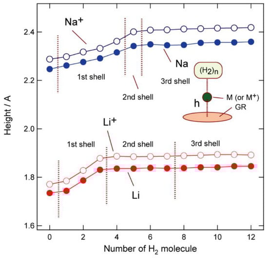 Distance (h) between Na and the GR surface are plotted in Figure 5 as functions of n; h was observed to increase with increasing n for both Na and Na+ to the second shell (n = 5) and became saturated at 2.35 Å (Na) and 2.42 Å (Na+). For lithium, the saturated distances were determined to be 1.85 Å (Li) and 1.89 Å (Li+) (from n = 5).