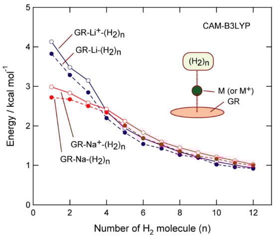 H2-GR-Na+ and H2-GR-Li+ binding energies are compared in Figure 6. The binding energy of the first addition of H2 to GR-Li was calculated to be 2.99 kcal/mol (n = 1), and gradually decreased with increasing n, with values of 2.58, 2.12, and 1.60 kcal/mol determined for n = 3, 5, and 7, respectively, for the GR-Na+-H2 system, and 2.58, 2.12, and 1.00 kcal/mol for the GR-Li+-H2 system, respectively.