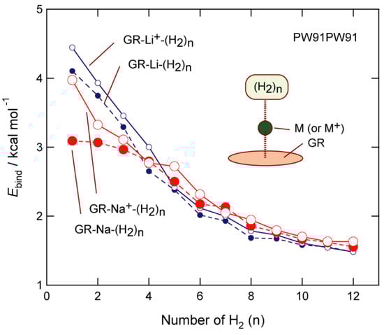 The effect of the DFT functional on the binding energy is examined in this section, with the PW91PW91 functional [34] used for the GR-Na, GR-Na+, GR-Li, and GR-Li+ systems. The binding energies of H2 to these systems are plotted as functions of n, the results of which are shown in Figure 7. H2 is bound more strongly to the GR-Li and GR-Li+ systems than the Na systems in the n = 1–4 range using the PW91PW91 functional, whereas the opposite trend was observed for n = 5. These features are in excellent agreement with those observed using the CAM-B3LYP functional, suggesting that the present system shows only minor functional dependence.