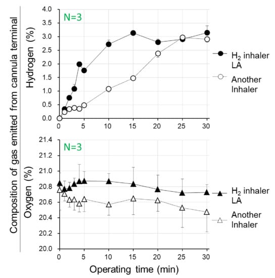 Two types of hydrogen gas inhalers, the H2-inhaler LA and another ordinary electrolysis-based device model, were operated for 30 min, and then concentrations of hydrogen and oxygen in the cannula terminal gas were quantified. Hydrogen concentrations for the H2-inhaler LA reached 3.0% at times as short as post-operating 10–15 min, when hydrogen gas was observed as dilute as 1.11–1.42% for another device, demonstrating that the H2-inhaler LA produced hydrogen gas more than 2.1-fold faster than another device model. Meanwhile, H2-inhaler LA stably maintained oxygen concentrations at 20.72–20.88%, being nearly equal to the atmospheric concentration of 21%, for continuous 30 min operation from the start, whereas oxygen concentrations gradually lowered, and reduced to 20.49% for another device (Figure 1).